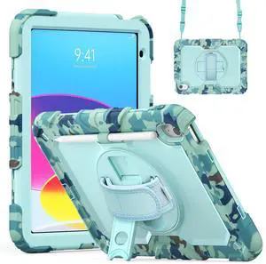 Dteck for iPad 11" A16 (11th Gen, 2025) / iPad 10.9" (10th Gen, 2022) Shockproof Case with Shoulder Strap/Pencil Holder/Rotating Kickstand/Screen Protector, 3-Layer Drop Proof Camouflage Cover, Blue