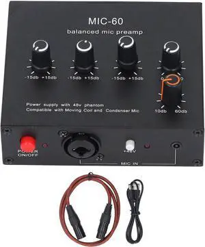 Microphone Audio Amplifier, Microphone Preamp, 3.5mm 6.5mm XLR Interface 60db Gain 48V Power Dynamic Condenser Mic Amplifier DC5 to 12V