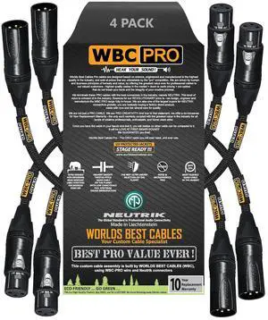 4 Units - 6 Inch - WBC-PRO-Quad Ultra-Silent Ultra-Flexible Balanced Star-Quad Cable with Neutrik Male & Female XLR Plugs & Black Tweed Jacket
