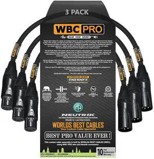 3 Units - 3 Foot - WBC-PRO-Quad Ultra-Silent Ultra-Flexible Balanced Star-Quad Cable with Neutrik Male & Female XLR Plugs & Black Tweed Jacket