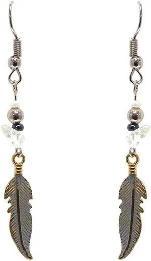Colored Metal Feather Charm Chip Stone Drop Dangle Earrings - Womens Southwest Fashion Handmade Jewelry Boho Accessories