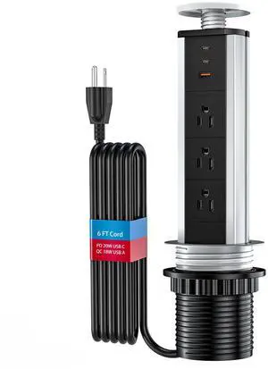 20W Pop Up Outlet for Kitchen Countertop, Retractable Recessed Outlet with 3 AC Outlet, 2 USB A Ports and 1 USB C Port for Kitchen Countertop Conference Office Recessed Power Outlet, Black &Silver