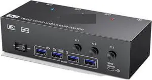Ennovor 2 Displayport + HDMI USB 3.0 KVM Switch 3 Monitors 3 Computers 8K@60Hz 4K@144Hz Triple Monitor KVM with 4 USB 3.0 Ports(with EU Plug)