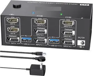 Ennovor KVM Switch 3 Monitors 2/3 Computers 8K 4K, 2 Displayport + HDMI USB 3.0 KVM Switch Triple Monitor with 4 USB 3.0 Port(AU Power Adapter,203DH)