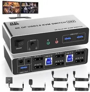 Ennovor 8K@60Hz USB 3.0 DisplayPort KVM Switch Dual Monitor 2 Computers, 8K KVM Switch DP 2 in 2 Out with Audio Microphone and 3 USB 3.0 Ports, 2 Computers 2 Monitors Keyboard Mouse Switcher