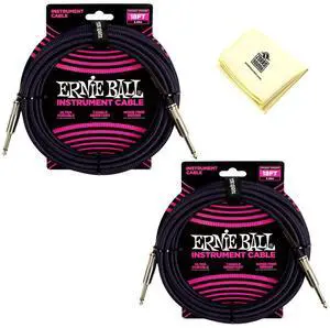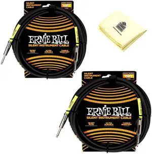 Ernie Ball Classic Silent Instrument Cable Straight/Straight with Zorro Instrument Cloth - Pack of 2 (Black, 10 Ft)