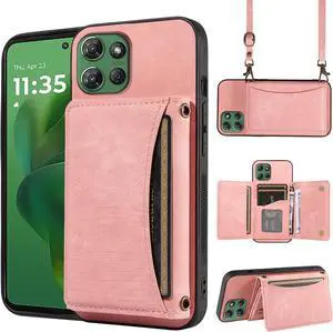 Phone Case for Motorola Moto G Power 5G 2025 Wallet Cover with Crossbody Shoulder Strap PU Leather Card Holder Pocket Slim Stand Cell Accessories Mobile Phone Flip Purse XT2515-1 Girls Women Pink