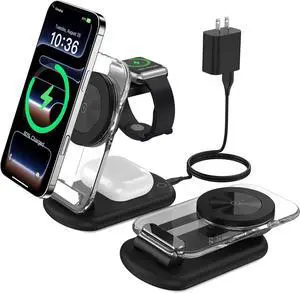 3 in 1 Charging Station for iPhone Mag-Safe Charger Qi2 Certified Rotating Wireless Charger Stand for iPhone 17 16 15 14 13 12 Series Watch AirPods (USB-C Charger Included)