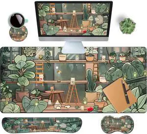 LIMKRIAN Cat Mouse Pad XXL Desk Mat Set, Green Ergonomic Mouse Pad with Wrist Rest, Large Gaming Mousepad Wrist Support Keyboard Mat Cup Coaster Set Cute Office Desk Decor Accessories