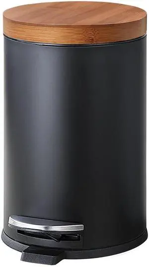 Elite Bamboo Lid 4.5 Liter / 1.2 Gallon Round Trash Can with Plastic Inner Bucket; Bathroom, Office, Kitchen and Bedroom Step On and Slow Close (Black)