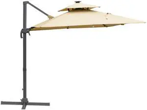 10FT Cantilever Patio Umbrella with Solar LED Lights & Power Bank, Double Top Outdoor Offset Umbrella with 360° Rotation, Tilt, Crank & Cross Base for Garden, Khaki