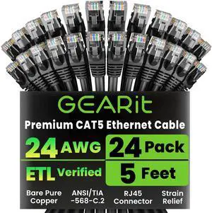GearIt 24-Pack, Cat5e Ethernet Patch Cable 5 Feet - Snagless RJ45 Computer LAN Network Cord, Black