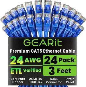 GearIT 24-Pack, Cat5e Ethernet Patch Cable 3 Feet - Snagless RJ45 Computer LAN Network Cord, Blue - Compatible with 24 48 Port Switch POE Rackmount 24port Gigabit