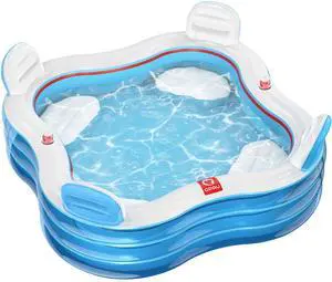 QPAU Inflatable Swimming Pool, Full-Sized Blow Up Pool with Seats and Backrests, Kiddie Pool for Outdoor & Backyard, for Family Summer Time Fun, Clear Blue