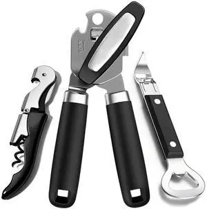 3PCS Can Opener Manual & Bottle Opener & Wine Opener, Smooth Edge Can Openers with Strong Magnet, Heavy Duty Stainless Steel Abrelatas Handheld Waiter Corkscrew - Premium Kitchen Supplies (Black)