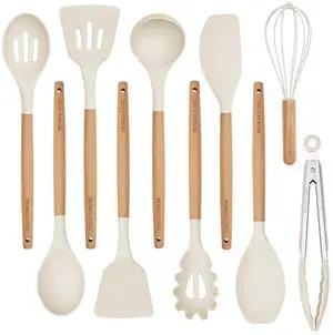 Silicone 10 Pcs Kitchen Cooking Utensils Set, Recycled Materials Certification, BPA Free Spatula Set with Heat Resistant Wood Handles for Nonstick Cookware, Cream White