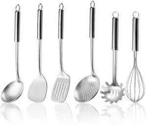 6-Piece Kitchen Cooking Utensils Set, Stainless Steel Kitchen Utensils with Suspendable Handle, Spatula, Slotted Turner, Soup Ladle, Slotted Spoon, Whisk, Pasta Server, Dishwasher Safe
