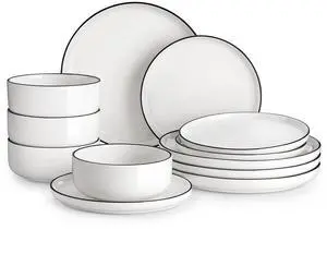 Plates and Bowls Sets, 12 Pieces Modern Porcelain Dinnerware Set for 4 White Kitchen Dinner Dining Ware Set wtih Black Rim Ceramic Dishware Dishes Microwave and Dishwasher Safe, Series LUNA