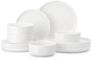 Plates and Bowls Sets, 12 Pieces Porcelain Dinnerware Sets Dishware Sets Chip Resistant Ceramic Dish Set Dining Dinner Ware Service for 4, White, Series LUNA
