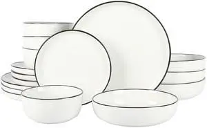 Oslo 16-Piece Porcelain Dinnerware Set, Service for 4 White Plates with Black Rim, Microwave & Dishwasher Safe
