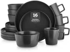 Celina Stoneware 16 Piece Modern Dinnerware Set, Plates and Bowls, Black Matte, Service for 4, Microwave & Dishwasher Safe