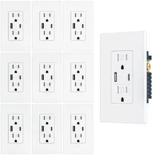 10 Pack - 4.8A/24W USB Outlet, Wall Outlet with Type C & Type A Ports, 15 Amp Receptacle Plug, Tamper-Resistant Receptacle, Screwless Wall Plate Include, UL Listed, White