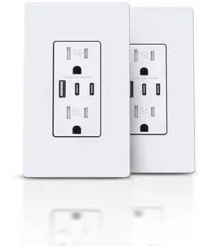 USB Outlet Receptacle, 3-Port USB C Wall Outlet, 30W 6.0A USB Charging Power Outlet, 15 Amp Tamper-Resistant Receptacle, ETL & FCC Listed, Screwless Wall Plate Included, White, 2 Pack