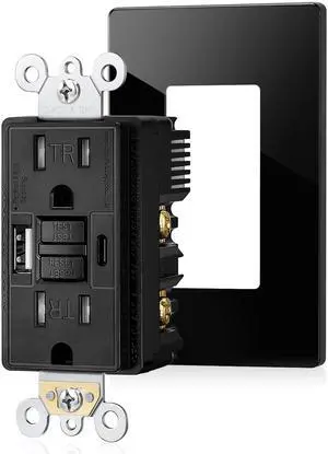 15 Amp GFCI Outlet with USB Ports, Self-Test GFCI Combination with USB-C & USB-A, Tamper-Resistant GFCI Electrical Outlet, GFCI Outlet with Screwless Wall Plate, ETL Listed, Black,1-Pack