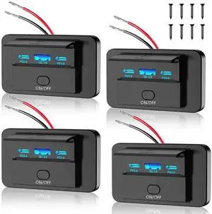 78W 4 Port 12V USB Outlet Wall Mount, Dual 36W PD & Dual 18W QC3.0 Lightweight Surface Mount Charger Socket Panel with Button Switch for Bus RV Truck Marine Golf Cart