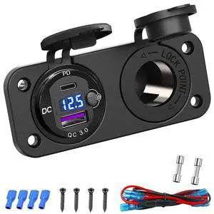 Cigarette Lighter Socket 12 Volt USB Outlet: PD 20W C and QC3.0 Car Port Aluminum Metal 12V Plug, 150W Charger Panel with Power Switch LED Voltmeter for Marine Boat RV Golf Cart