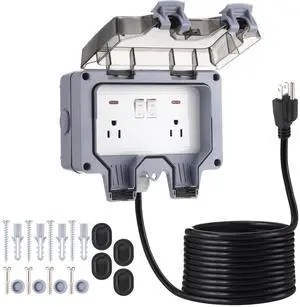 30ft Outdoor Outlet Box with Extension Cord and Cover, Dual 15 Amp 5-15 Receptacles Weatherproof Waterproof Ip66 Outdoor Exterior Socket with Switch and Indicator Light, 14 AWG/3C SJTW Cord