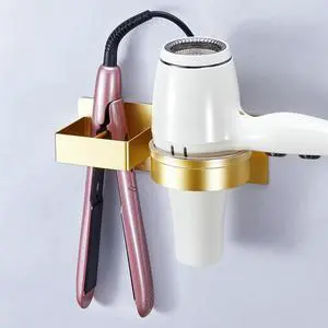 Wall Mount Hair Dryer and Straightener Holder, Metal Blow Dryer Holder Rack Adhesive, Hairdryer Holder for Bathroom Salon Barber Shops (Gold)