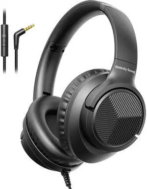 Headphones Wired with Microphone, Over Ear Foldable 3.5mm Plug in Headphones with 4.9ft Tangle-Free Nylon Cord for Tablet, Laptop, MP3/4, School, Airplane Travel (Black)
