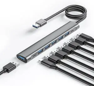 6Ft 7-Port USB Hub 3.0 for Desktop, 4 USB-A & 3 USB-C Ports Aluminium 5Gbps USB Extender Hub, USB Splitter, USB Hub Long Cable for Desktop, PC, Flash Drive, Mobile HDD SSD, Windows/XPS