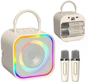 Karaoke Machine for Kids and Adults, Mini Portable Bluetooth Speaker with 2 Wireless Microphones, Led Lights for TV, Kids Gifts for Girls Boys Family Party Birthday (Beige)