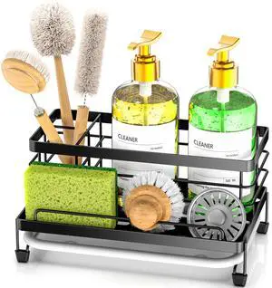 Rustproof Kitchen Sink Organizer for Countertop,Multifunctional Sink Organizer Caddy & Organization,Scrub Brush and Sponge Holder,Plastic Sink Storage Rack,Sponge Drain Rack,Dish Soap Dispenser,Black