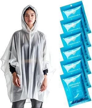 Disposable Rain Ponchos for Adults - Clear with Hood, Compact Emergency Ponchos for Hiking, Camping, Travel - Pack of 6