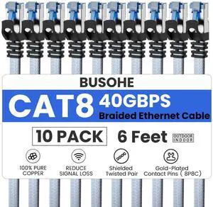 Cat 8 Ethernet Cable 6 FT 10 Pack, Nylon Braided High Speed Heavy Duty Network LAN Patch Cord, 40Gbps 2000Mhz SFTP Shielded RJ45 Flat Internet Cable for TV/PC/Router, in Wall, Indoor, Outdoor