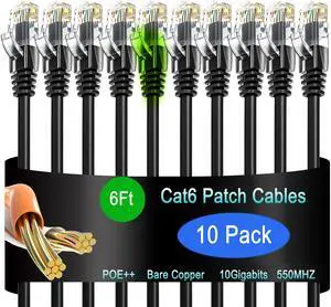 Cat6 Ethernet Patch Cable 6 ft (10 Pack), Cat6 Patch Cable for Data Centers, Cat 6 Patch Cable 10G, Network Patch Cables for Home and Enterprise Network -Black