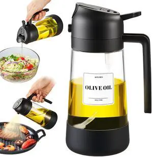2-in-1 Oil Sprayer and Dispenser, 16oz / 470mL Glass Olive Oil Bottle for Cooking, Grilling, and Salad Dressing BPA-Free, Easy-Pour, Anti-Clog Nozzle, Dishwasher Safe (Black)