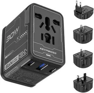 Universal Travel Adapter 30W GaN, All-in-One International Power Adapter with 2 USB-C & 1 USB-A, Worldwide Plug Converter for EU/US/UK/AU in 200+ Countries