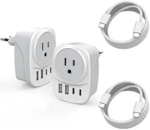 European Travel Plug Adapter,Universal Travel International Power Adapter 2 USBC Port and 2 USBA Port,Fast Charging USB C-C Woven Cable,USB C Power Plug for US to Europe Adapters for Multiple Devices
