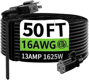 Features: This 50 FT power extension cord is made by PlugSaf and features a 16/3 Extension Cord style with pvc material. It supports a voltage of 125 volts_of_alternating_current and an input current of . The cable is Black in color and is UL listed. It comes with a Male-to-Female connector and does not require batteries.