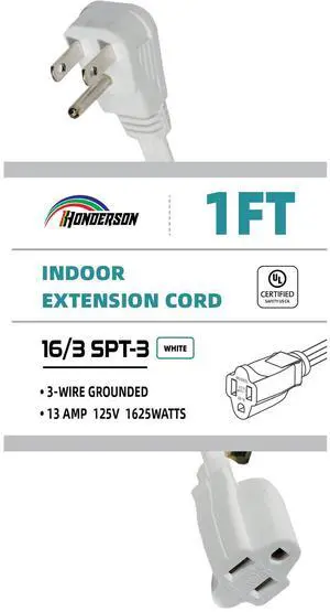 Features: This 1FT power extension cord is made by HONDERSON and features a 16/3 style with material. It supports a voltage of 125 volts and an input current of . The cable is White in color and is UL listed. It comes with a Male-to-Female connector and does not require batteries.
