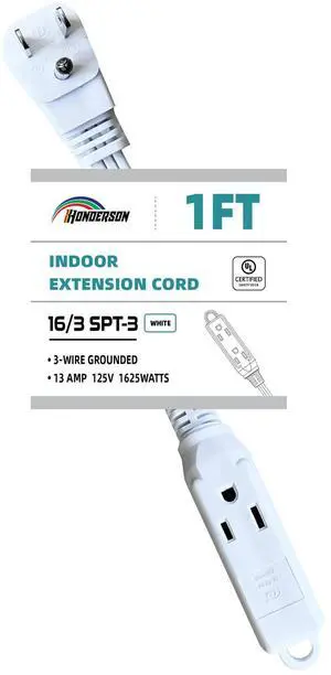 Features: This 1FT power extension cord is made by HONDERSON and features a 16/3 style with material. It supports a voltage of 125 volts and an input current of . The cable is White in color and is UL listed. It comes with a Male-to-Female connector and does not require batteries.