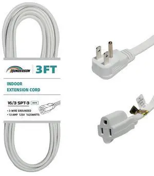 Features: This 3FT power extension cord is made by HONDERSON and features a 16/3 style with copper material. It supports a voltage of 125 volts and an input current of . The cable is White in color and is UL listed. It comes with a Male-to-Female connector and does not require batteries.