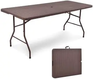 GYMAX 6FT Folding Table, Portable Lightweight Camping Table with Carry Handle, Easy Fold Up Rectangle Indoor/Outdoor Collapsible Table for Camp, Picnic, BBQ, Patio (Rattan Tabletop with Umbrella Hole)