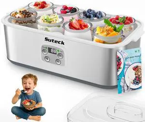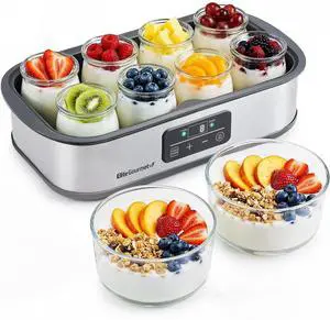 Digital Yogurt Maker, Programmable Temp & Time Control (68127°F), Includes 8 Glass Jars (6 oz) + 2 Large 1-Qt Bowls, Stainless Steel, Auto Shut-Off