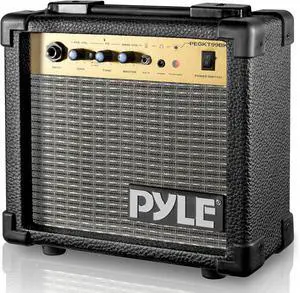 Pyle Portable Mini Electric Guitar Amp - 10 Watt Practice Instrument Amplifier w/ 5" Loudspeaker, Volume,Bass, Treble, Distortion,Gain Controls, Headphone Output,Carry Handle,Leather/Wood Construction
