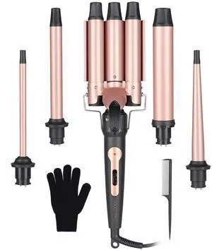 Wand Curling Iron Hair Crimper, Emocci Pro Large 3 Barrel (0.35"-1.25" Ceramic Barrel) Hair Crimper for Women Beach Waves Instant Heat Hair Waver Set for Long Hair Curlers 5-in-1 Curling Wand Set